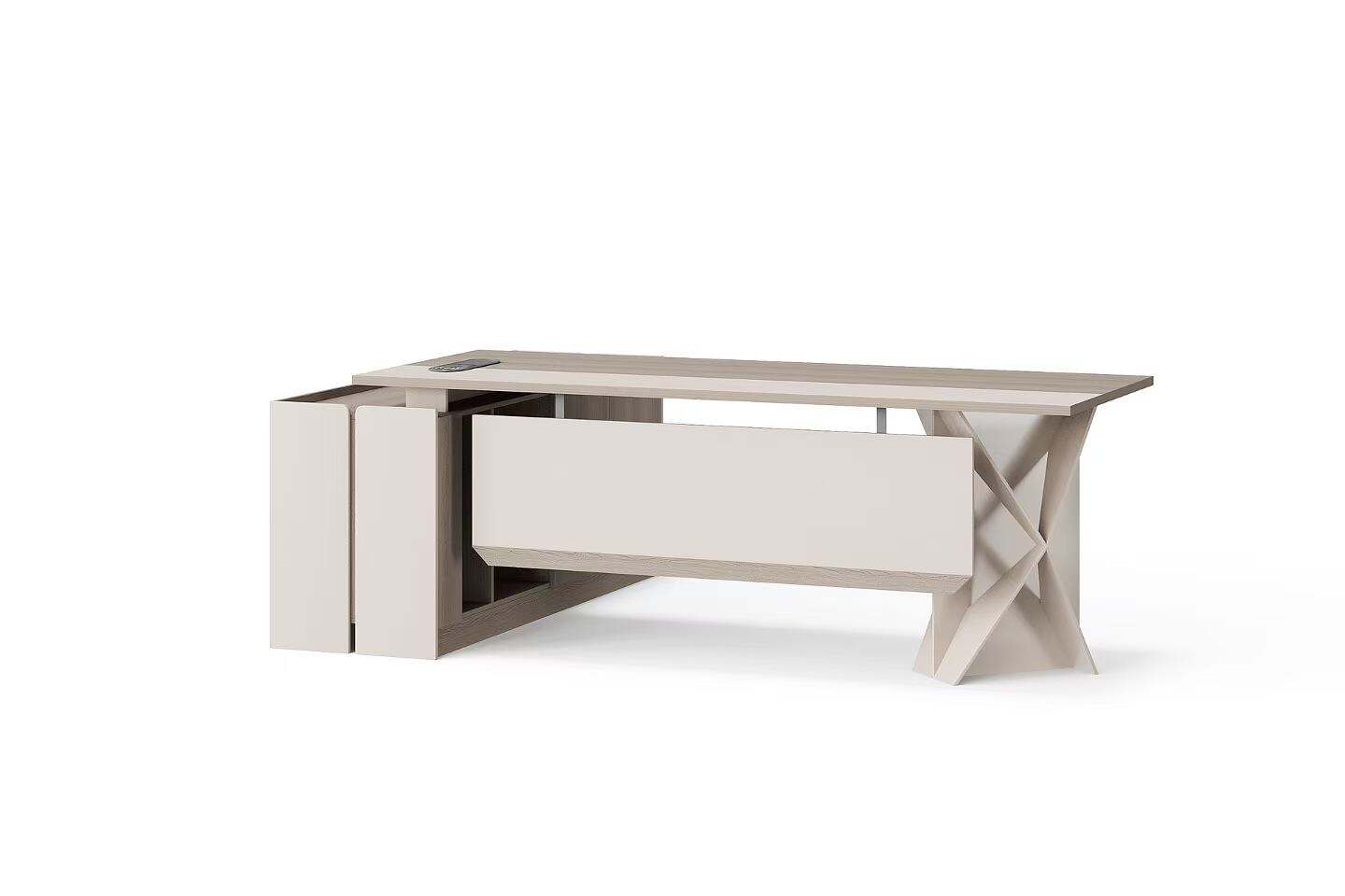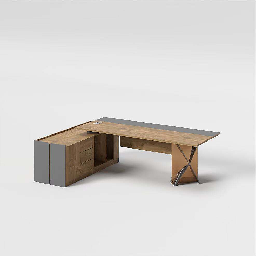 The L-shaped desk is designed to maximize workspace efficiency, with a spacious wooden top and a sleek gray side panel. It includes built-in drawers for organized storage and is supported by sturdy, X-shaped metal legs that ensure stability while adding an industrial touch to the design.