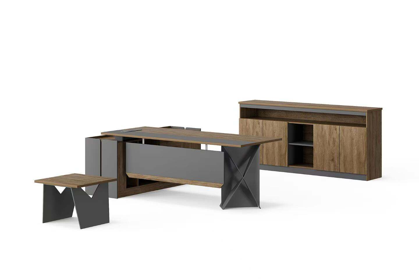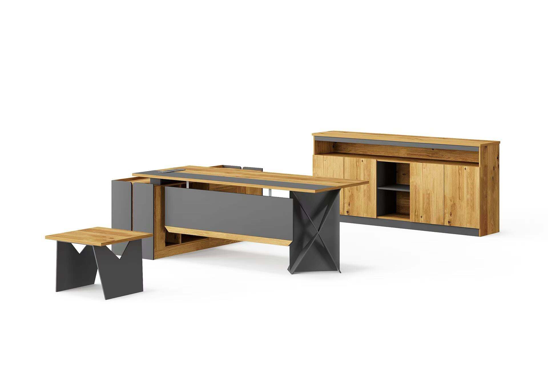 Transform your workspace with our contemporary L-shaped Office Desk Set, combining functionality and style for a productive office environment. This set includes an L-shaped desk, a coffee table, and a bookshelf, all featuring a harmonious blend of natural wood and dark gray finishes.