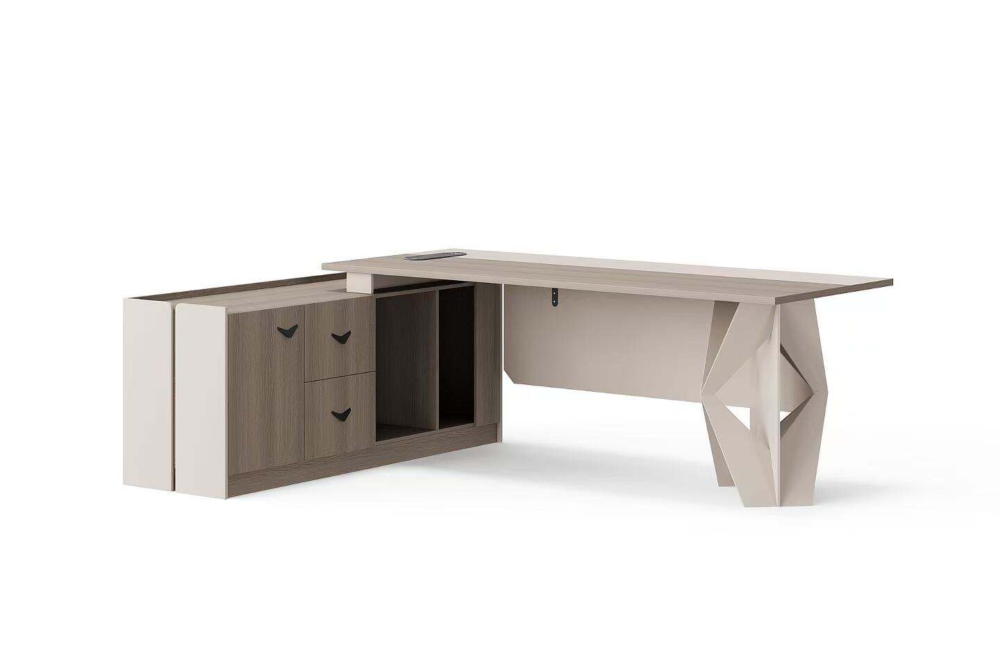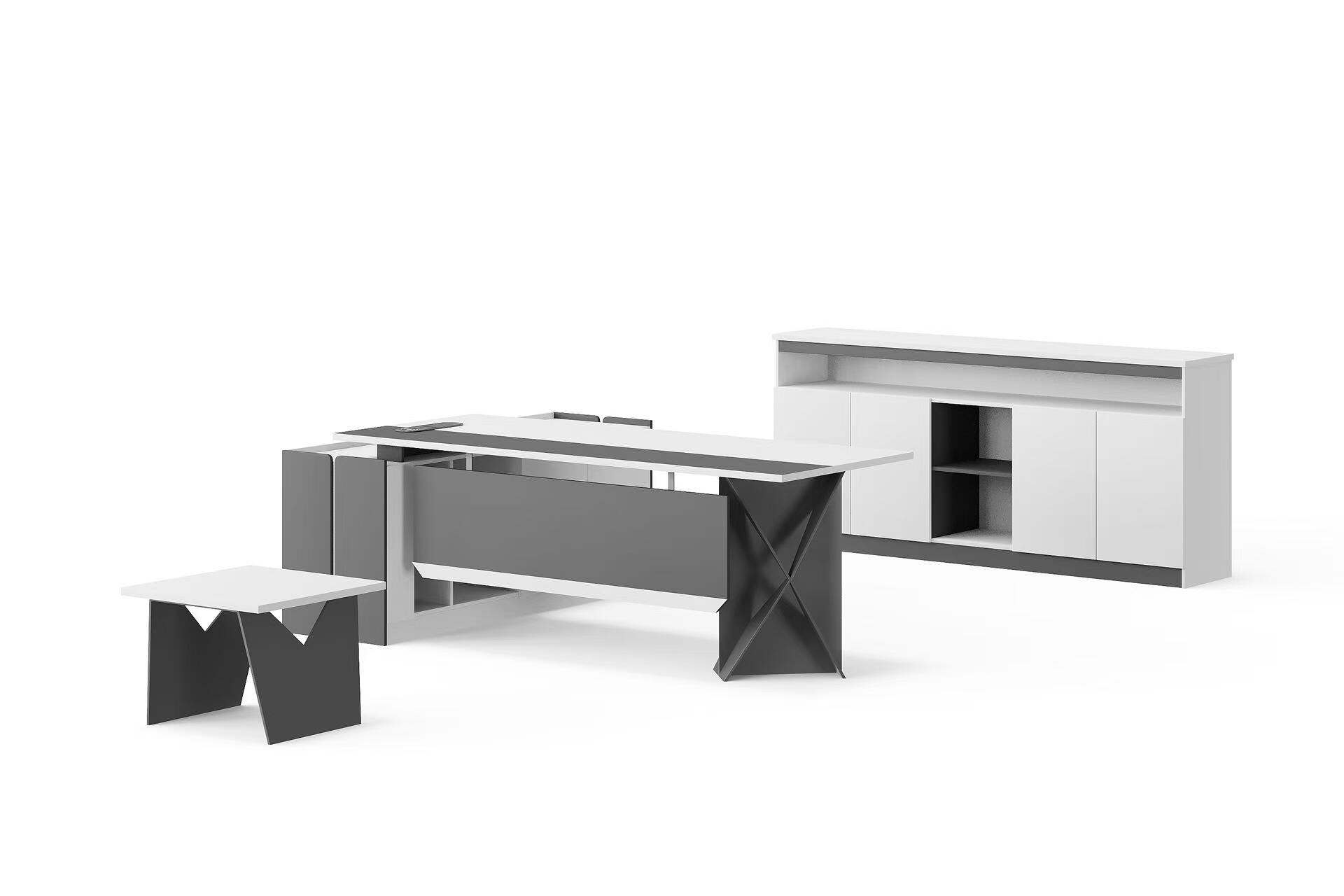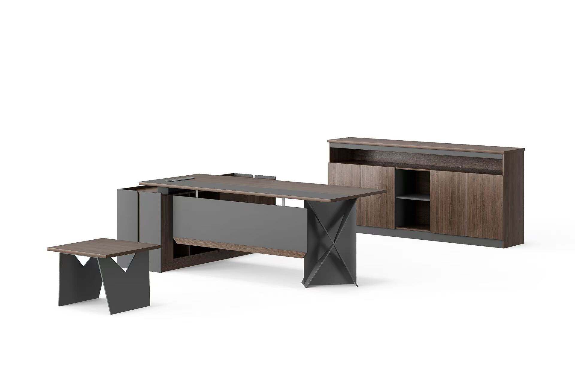 The bookshelf, with its wooden finish and dark gray accents, provides additional storage options. It features enclosed cabinets and open shelves, allowing for a mix of display and concealed storage. This piece is perfect for organizing books, files, and personal items, while also adding a touch of elegance to your office.