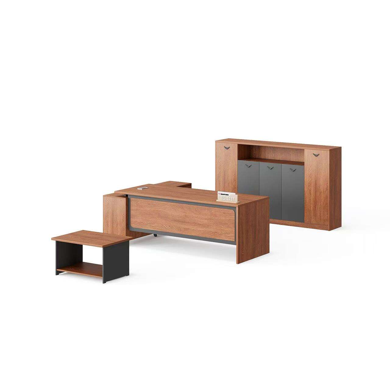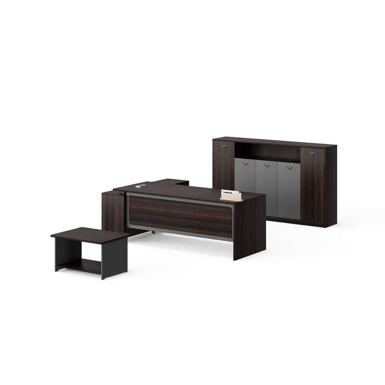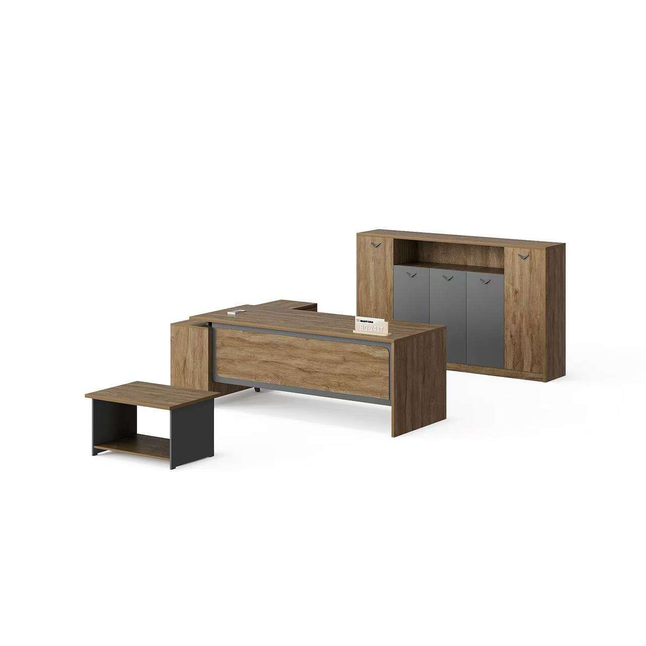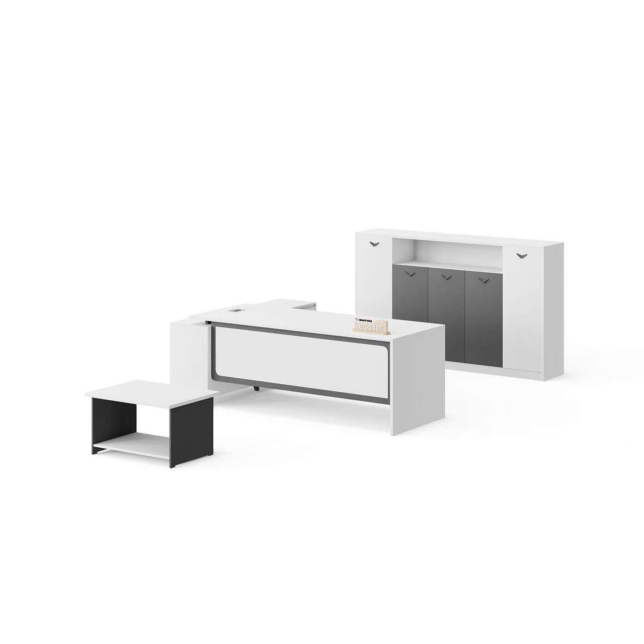 Introducing our modern-style L shape office table. This set includes a L shape table, a cabinet, and a coffee table. Its unique design and color scheme make the table set stand out. We offer a variety of colors and sizes for you to choose from, allowing for customizable combinations to meet your needs.
