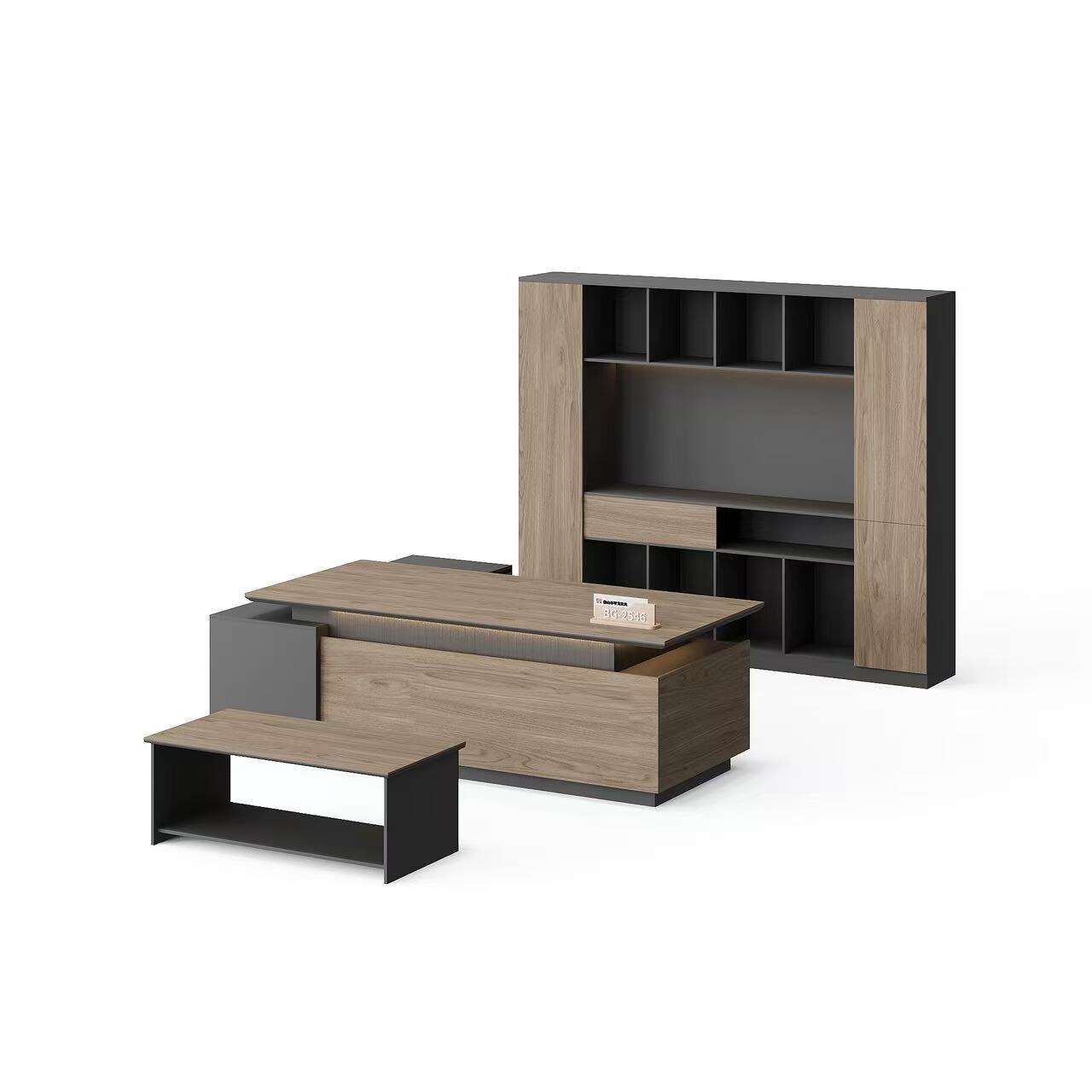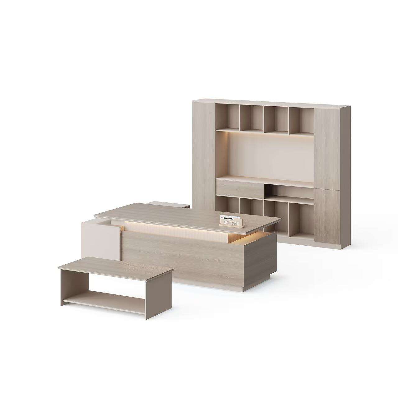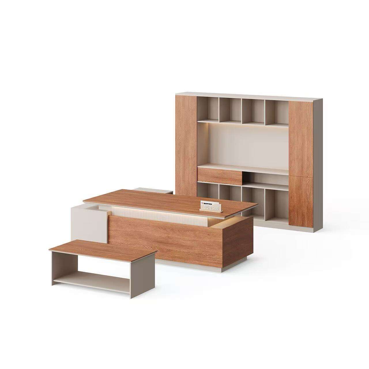 Introducing our modern-style office table. This set includes a L shape table, a cabinet, and a coffee table. Its unique design and color scheme make the desk set stand out. We offer a variety of colors and sizes for you to choose from, allowing for customizable combinations to meet your needs.