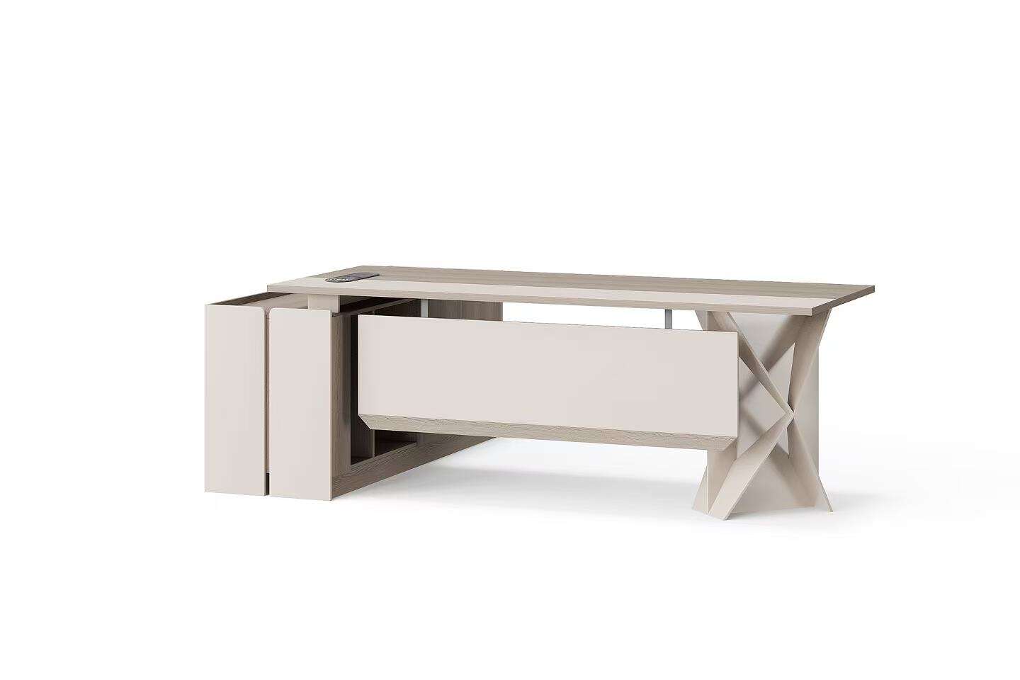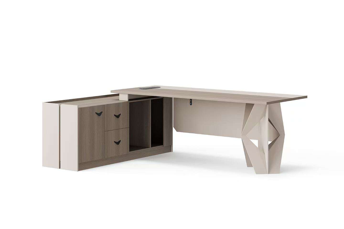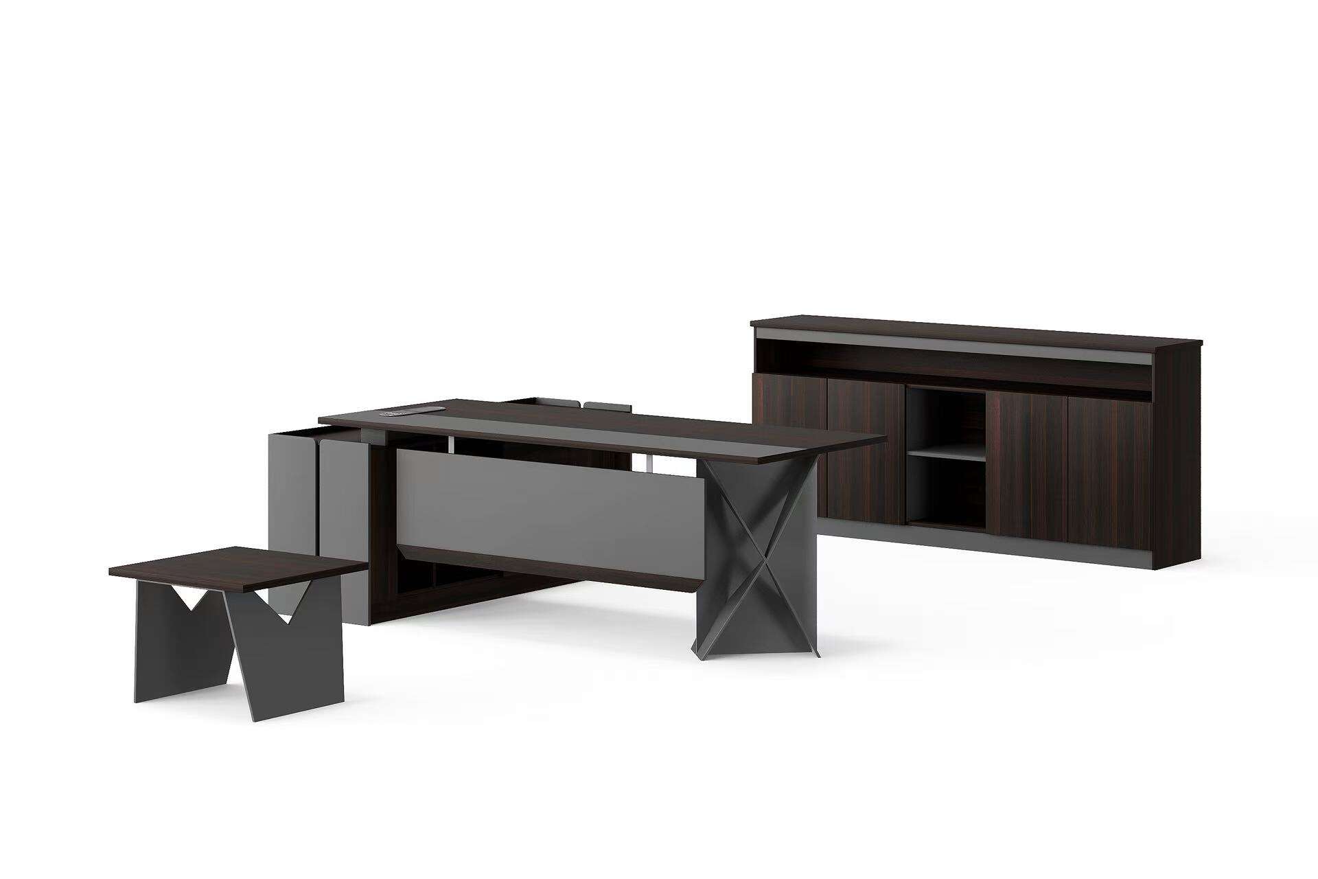 Introducing our modern-style L shape office table. This set includes a L shape table, a cabinet, and a coffee table. Its unique design and color scheme make the table set stand out. We offer a variety of colors and sizes for you to choose from, allowing for customizable combinations to meet your needs.
