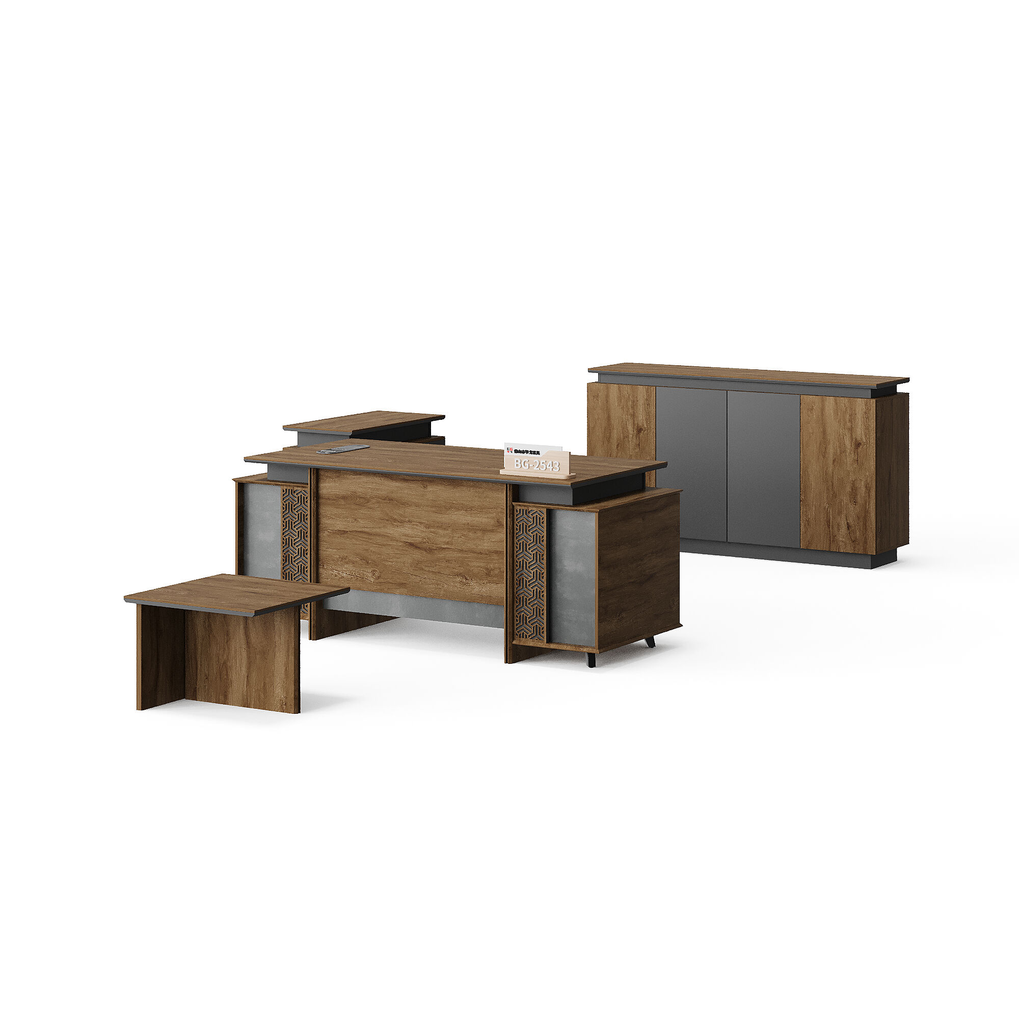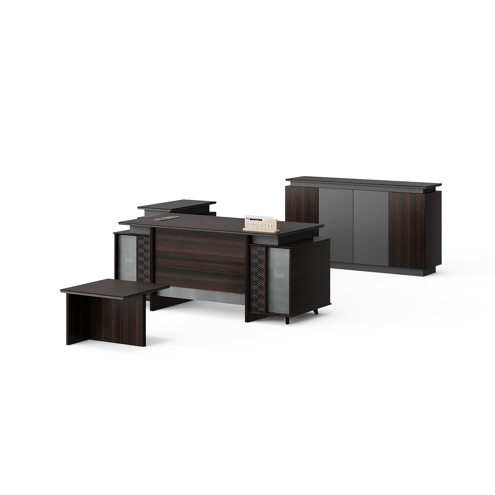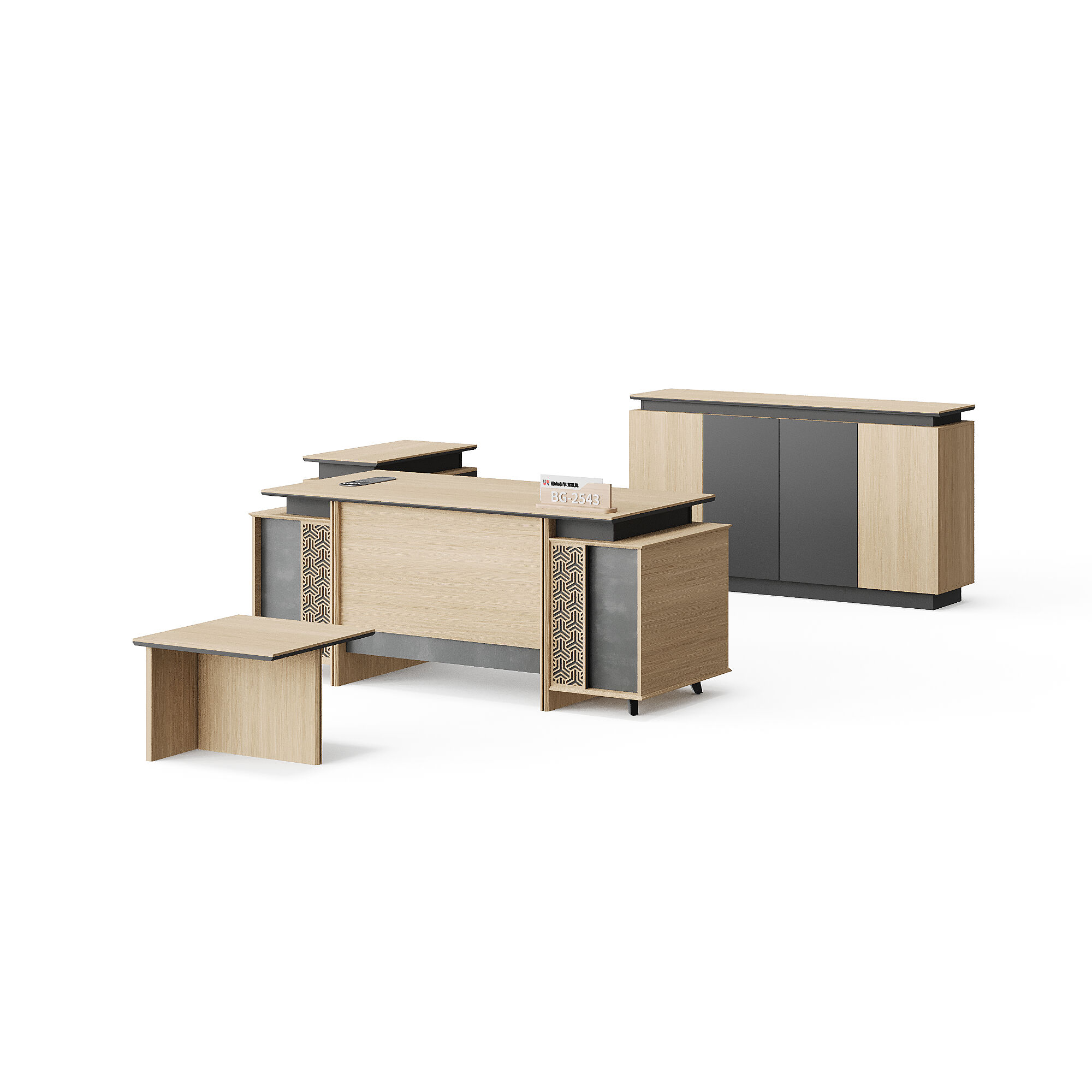 Introducing our modern-style office table. This set includes office table, a side table, a cabinet, and a coffee table. Its unique design and color scheme make the desk set stand out. We offer a variety of colors and sizes for you to choose from, allowing for customizable combinations to meet your needs.
