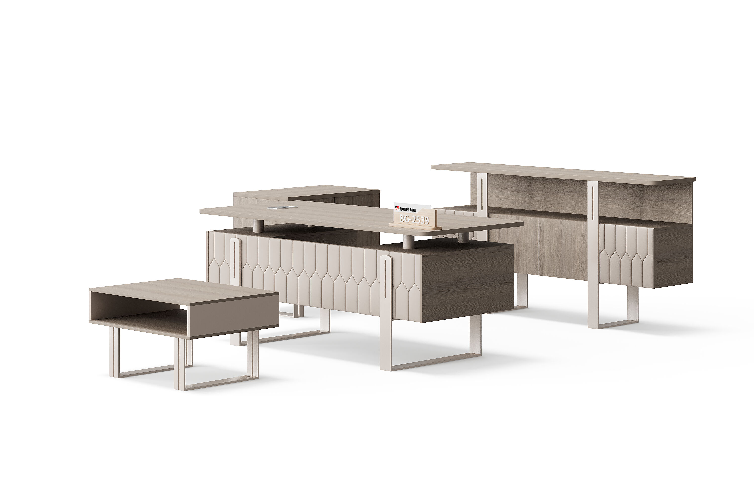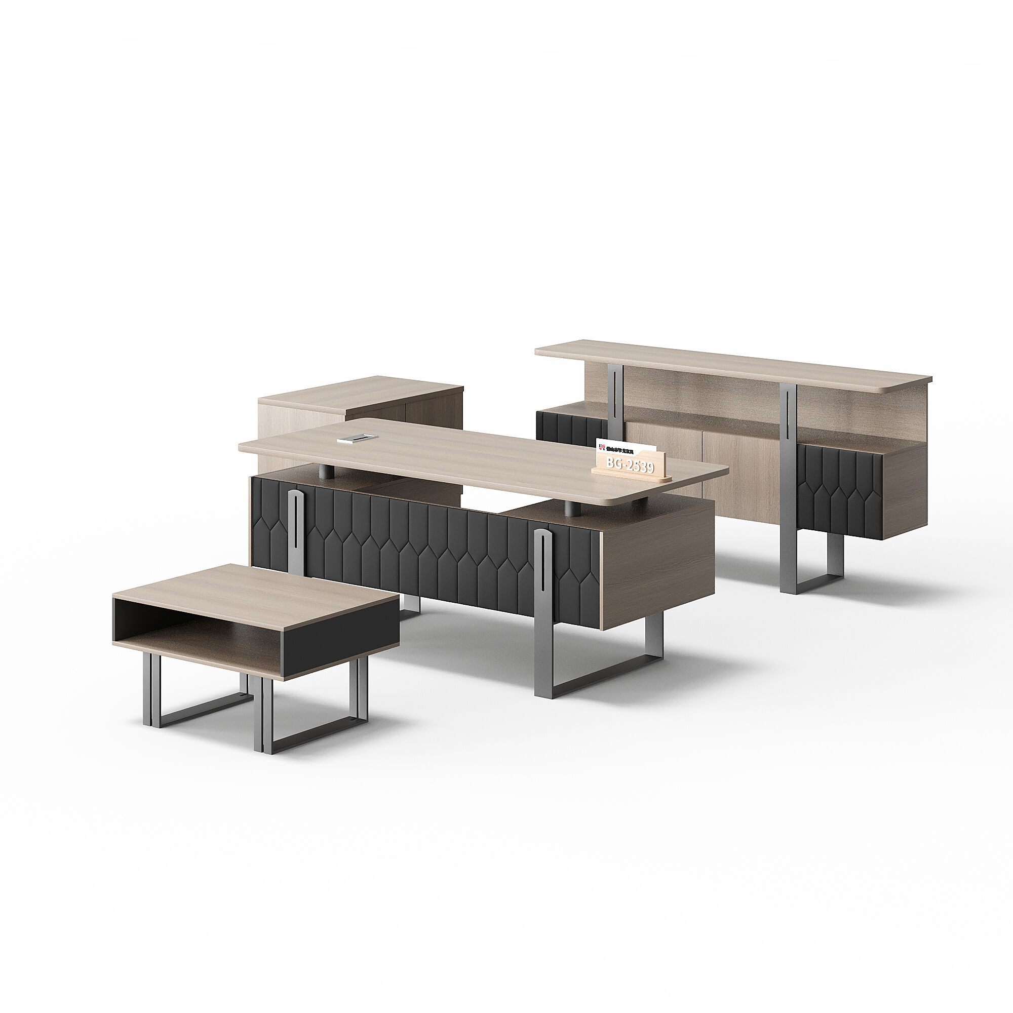 Introducing our modern-style office table. This set includes office table, a side table, a cabinet, and a coffee table. Its unique design and color scheme make the desk set stand out. We offer a variety of colors and sizes for you to choose from, allowing for customizable combinations to meet your needs.