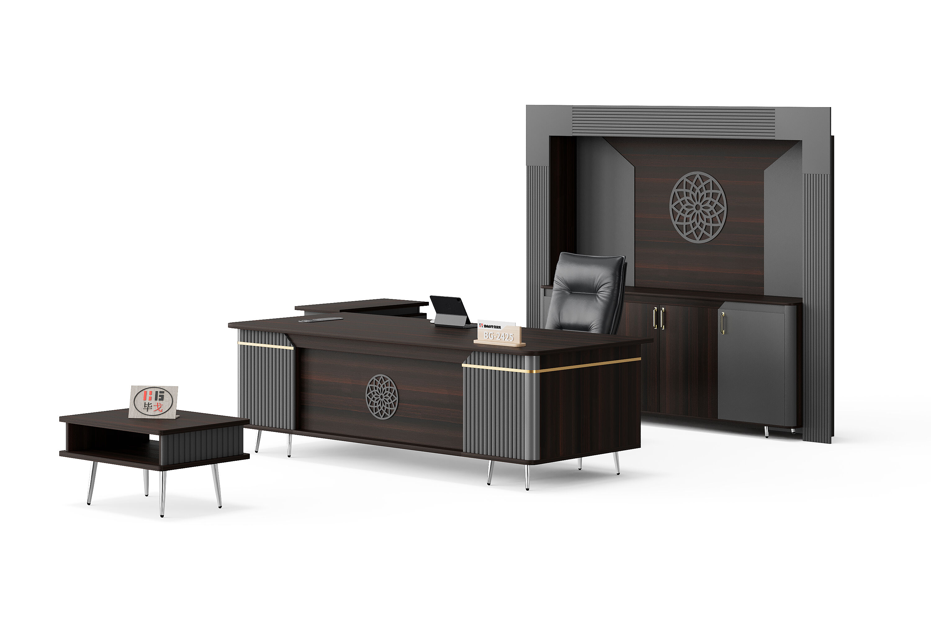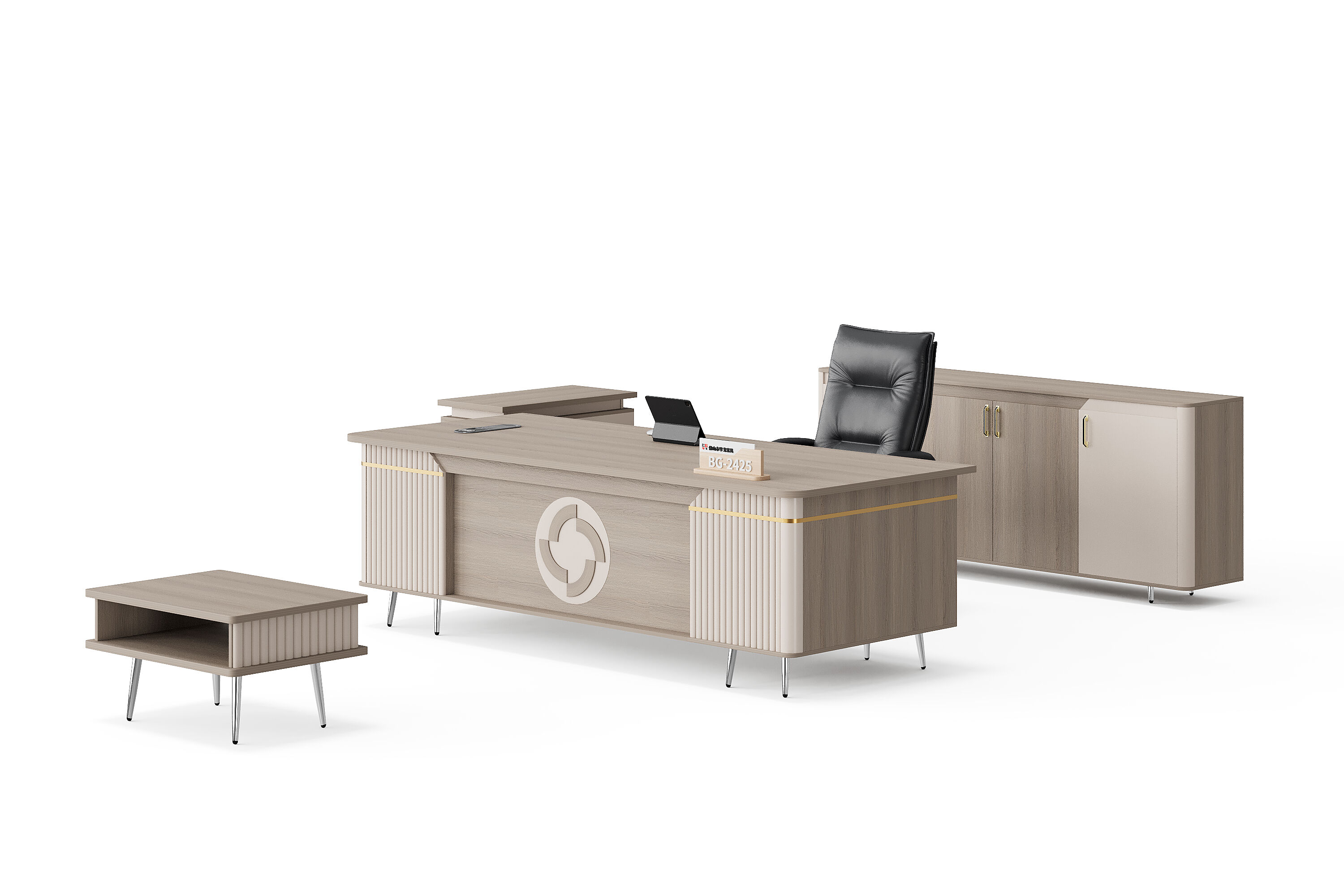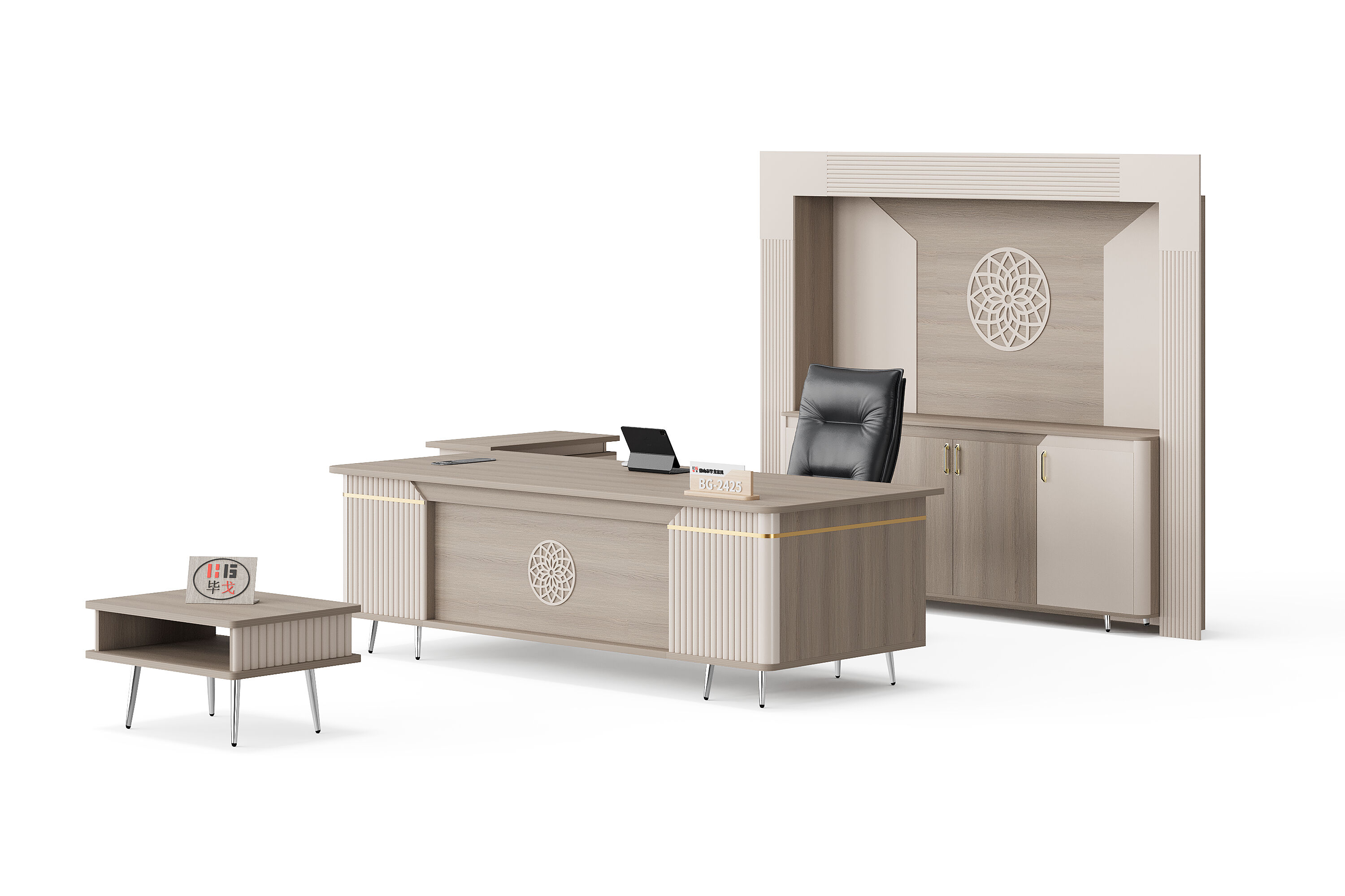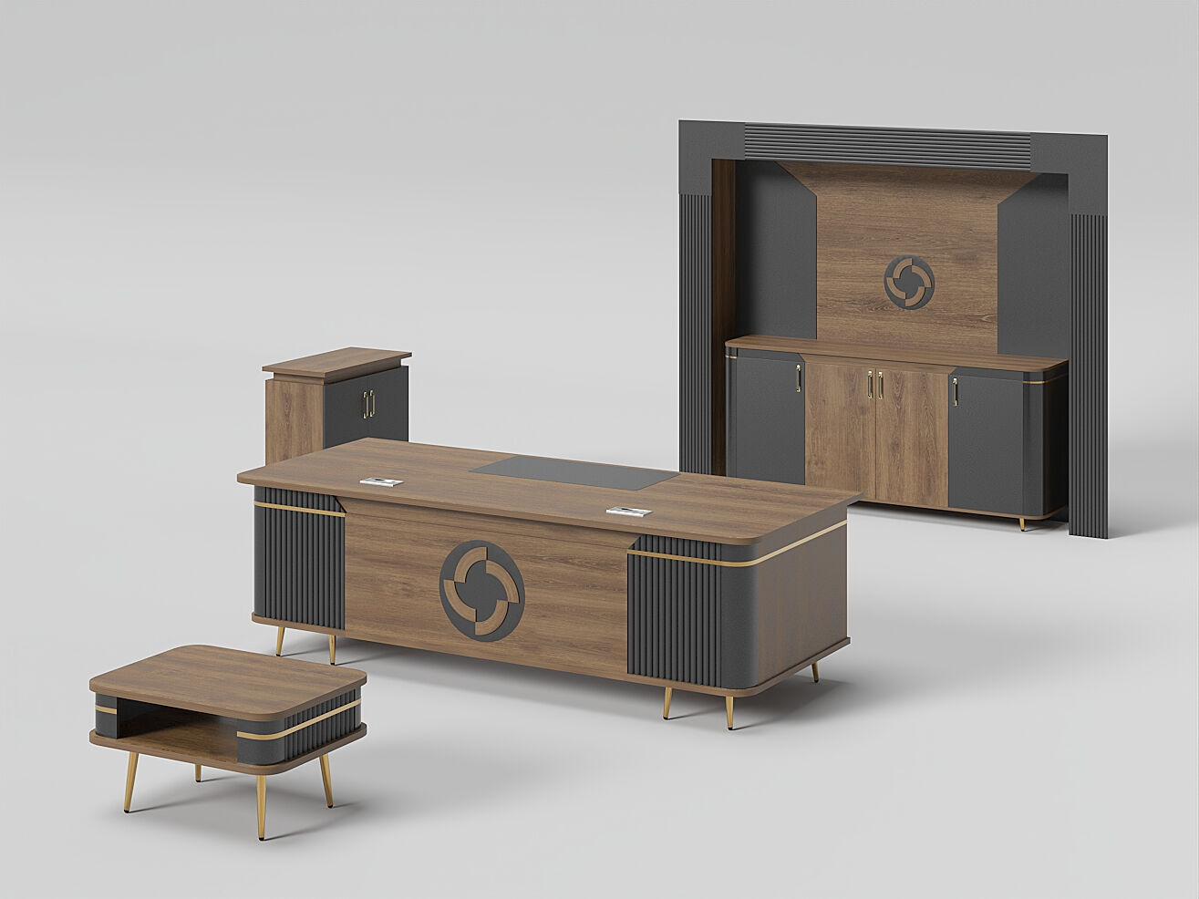 Introducing our modern-style office table. This set includes an office table, a side table, a cabinet, and a coffee table. Its unique design and color scheme make the table set stand out. We offer a variety of colors and sizes for you to choose from, allowing for customizable combinations to meet your needs.