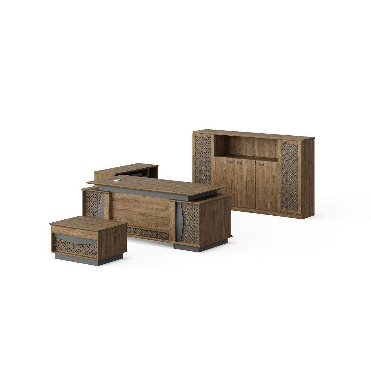 Introducing our modern-style office table. This set includes an office table, a side table, a cabinet, and a coffee table. Its unique design and color scheme make the table set stand out. We offer a variety of colors and sizes for you to choose from, allowing for customizable combinations to meet your needs.