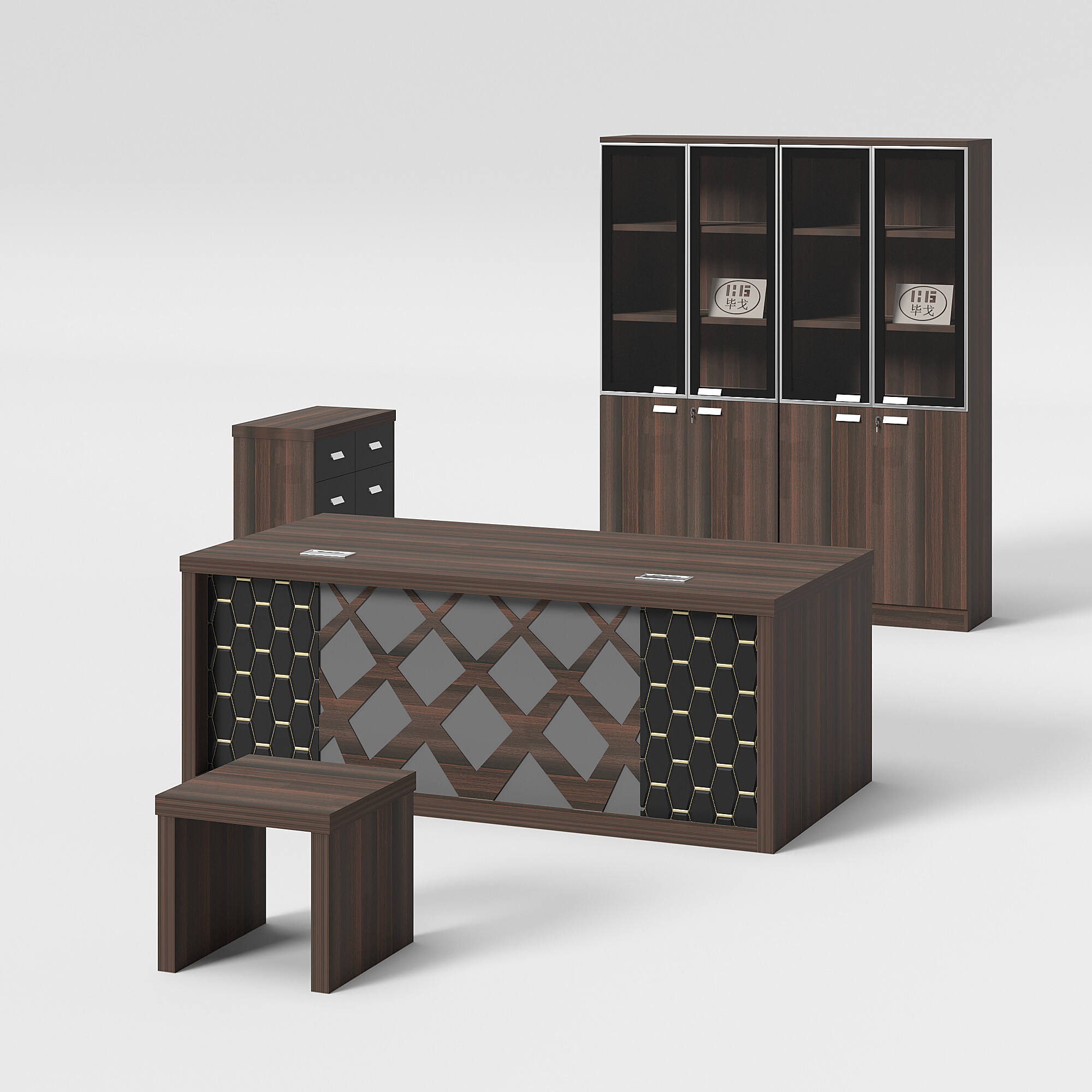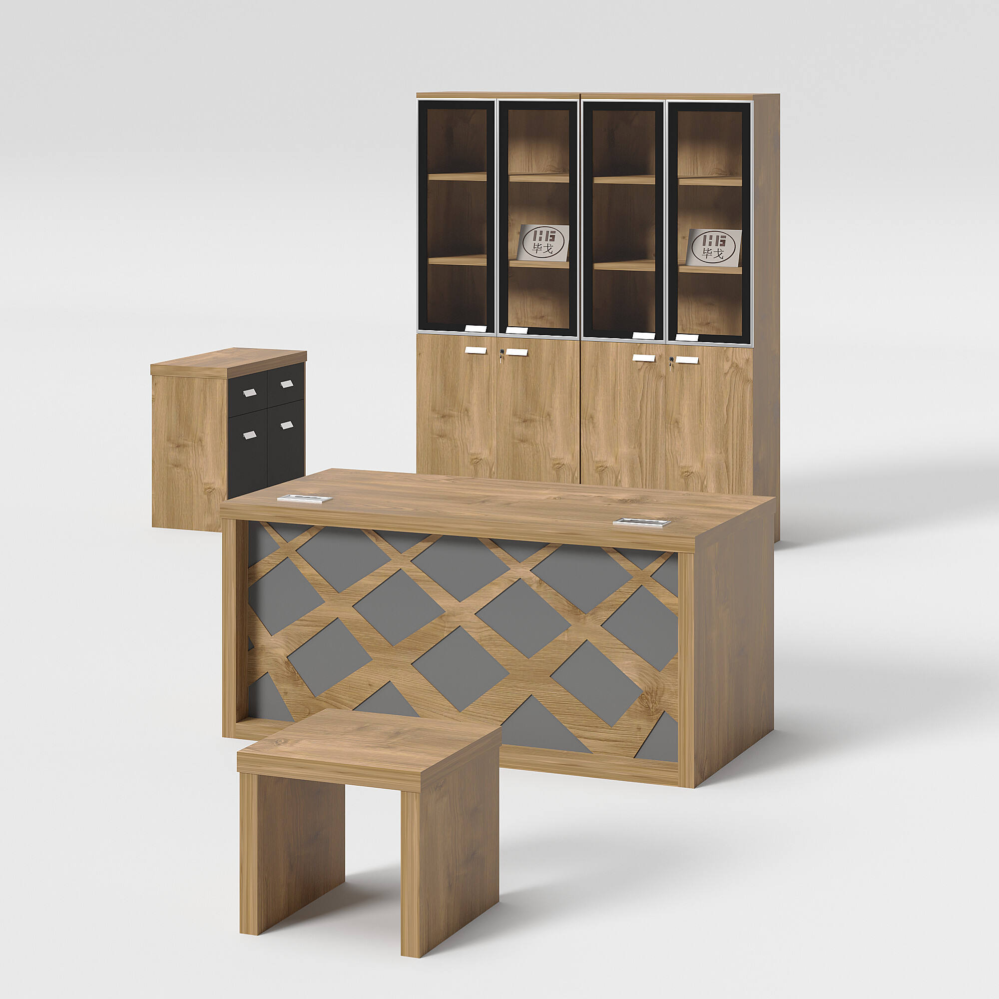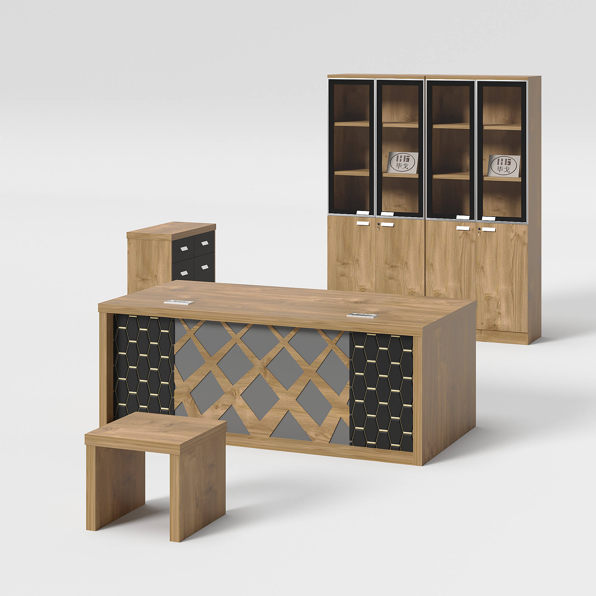 Introducing our modern-style office table. This set includes an office table, a side table, a cabinet, and a coffee table. Its unique design and color scheme make the table set stand out. We offer a variety of colors and sizes for you to choose from, allowing for customizable combinations to meet your needs.