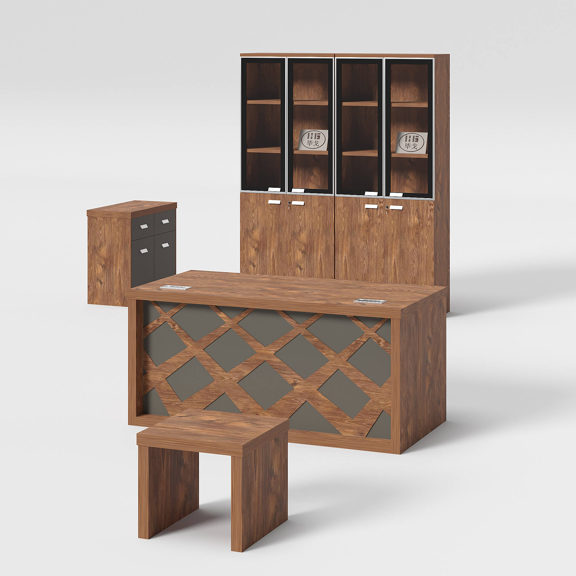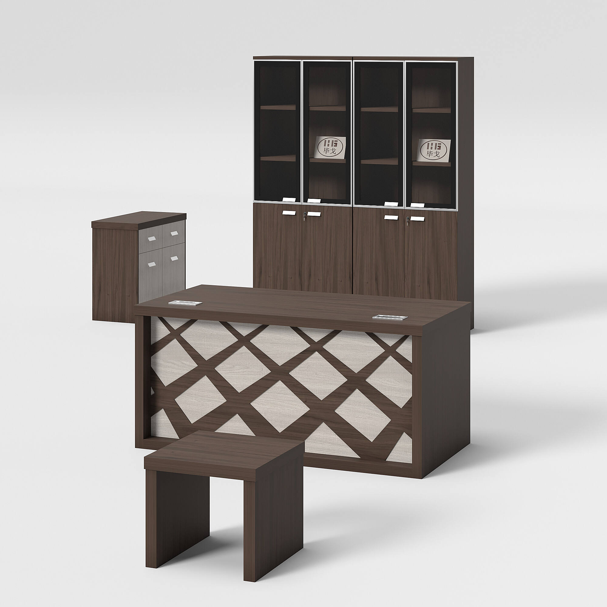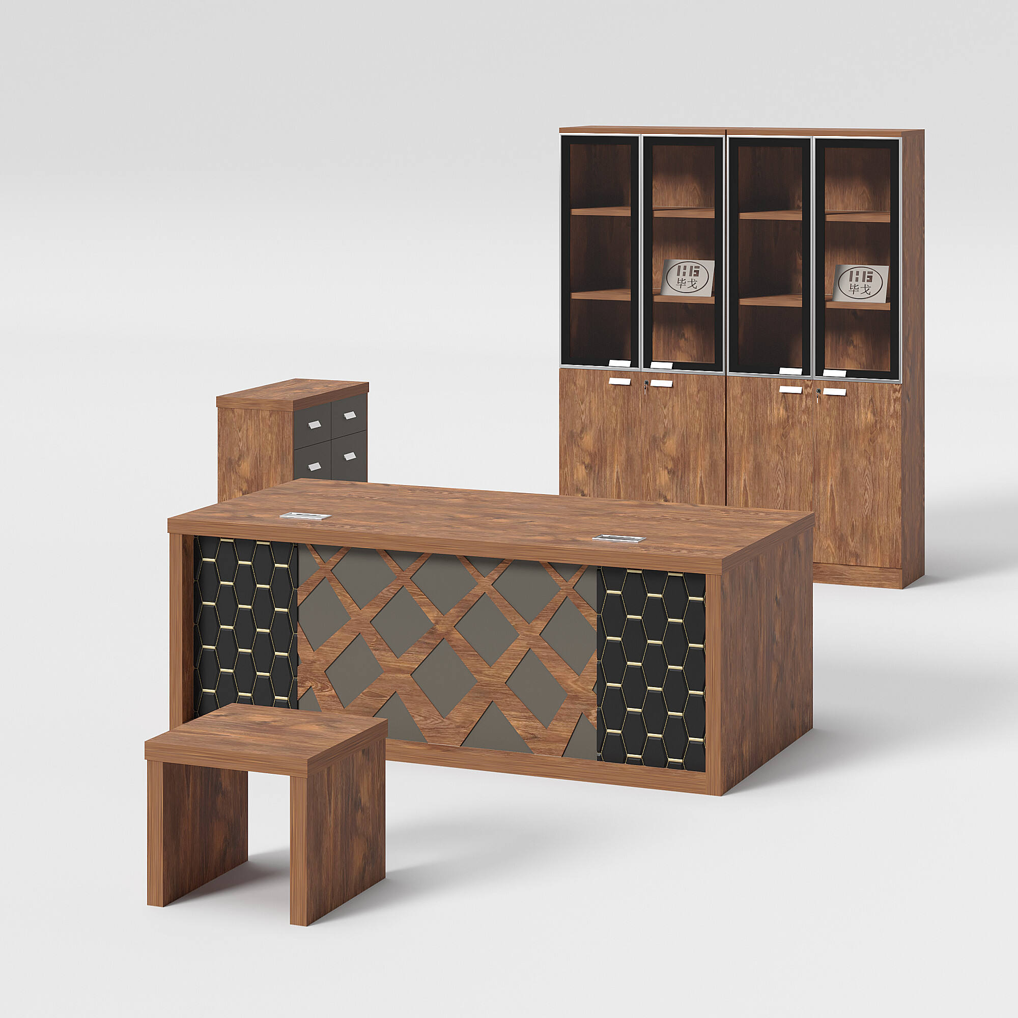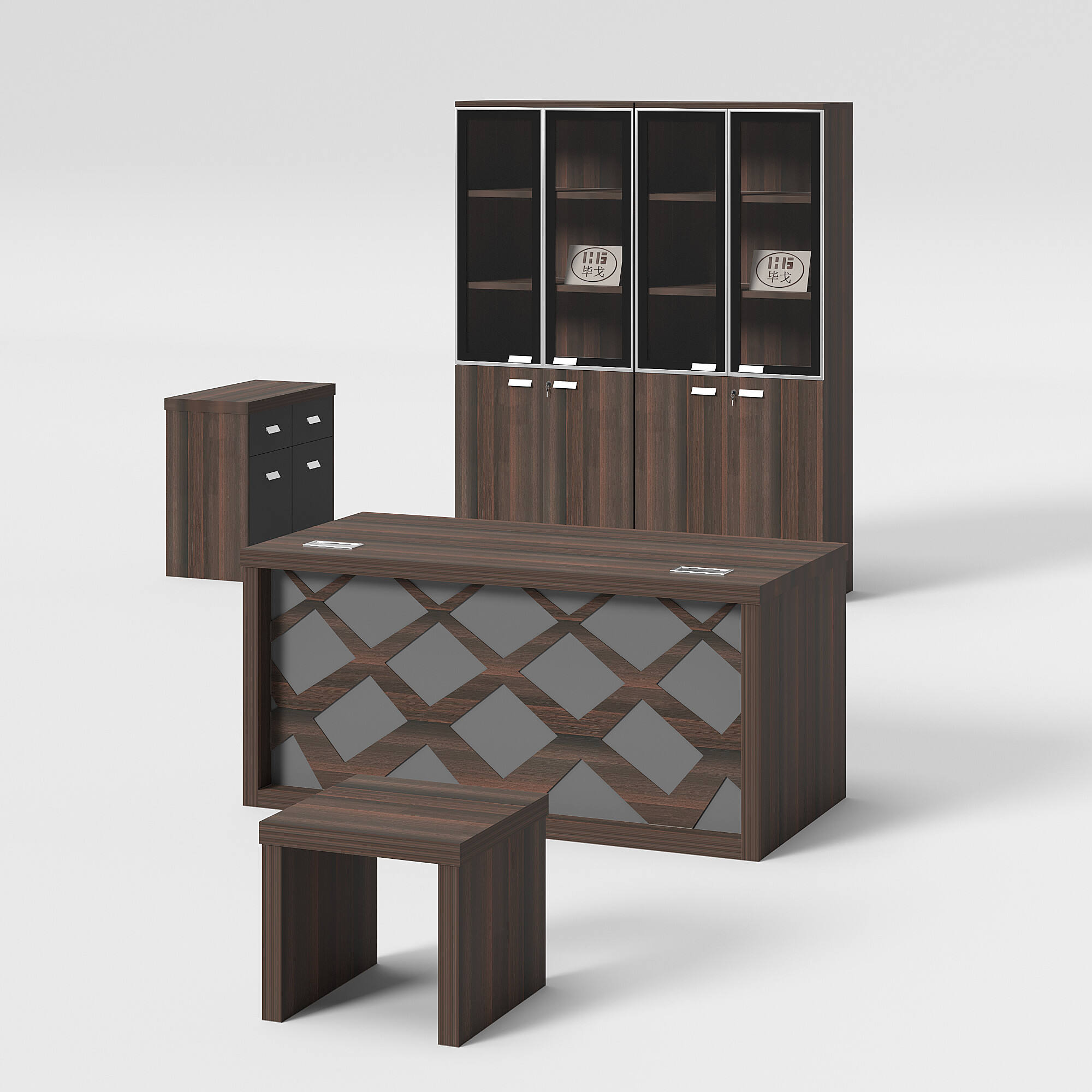 Introducing our modern-style office table. This set includes an office table, a side table, a cabinet, and a coffee table. Its unique design and color scheme make the table set stand out. We offer a variety of colors and sizes for you to choose from, allowing for customizable combinations to meet your needs.