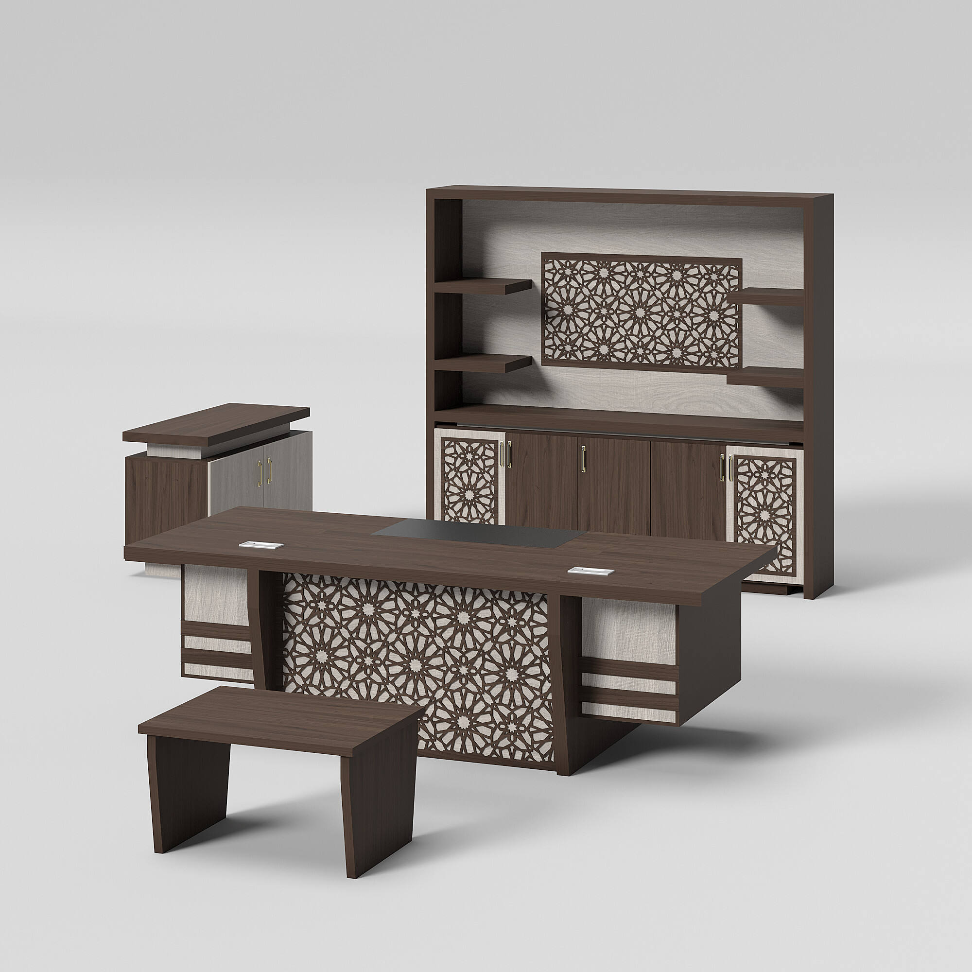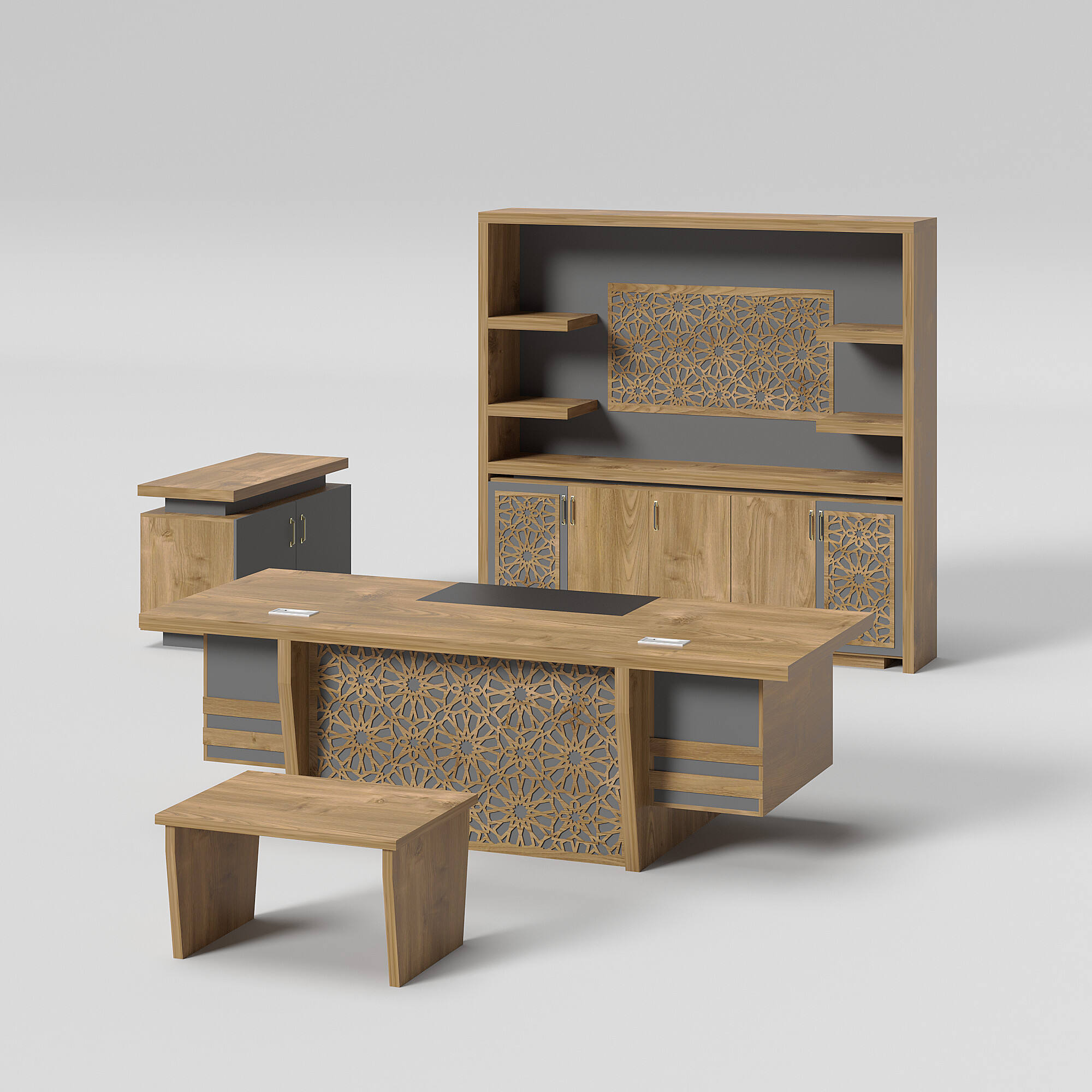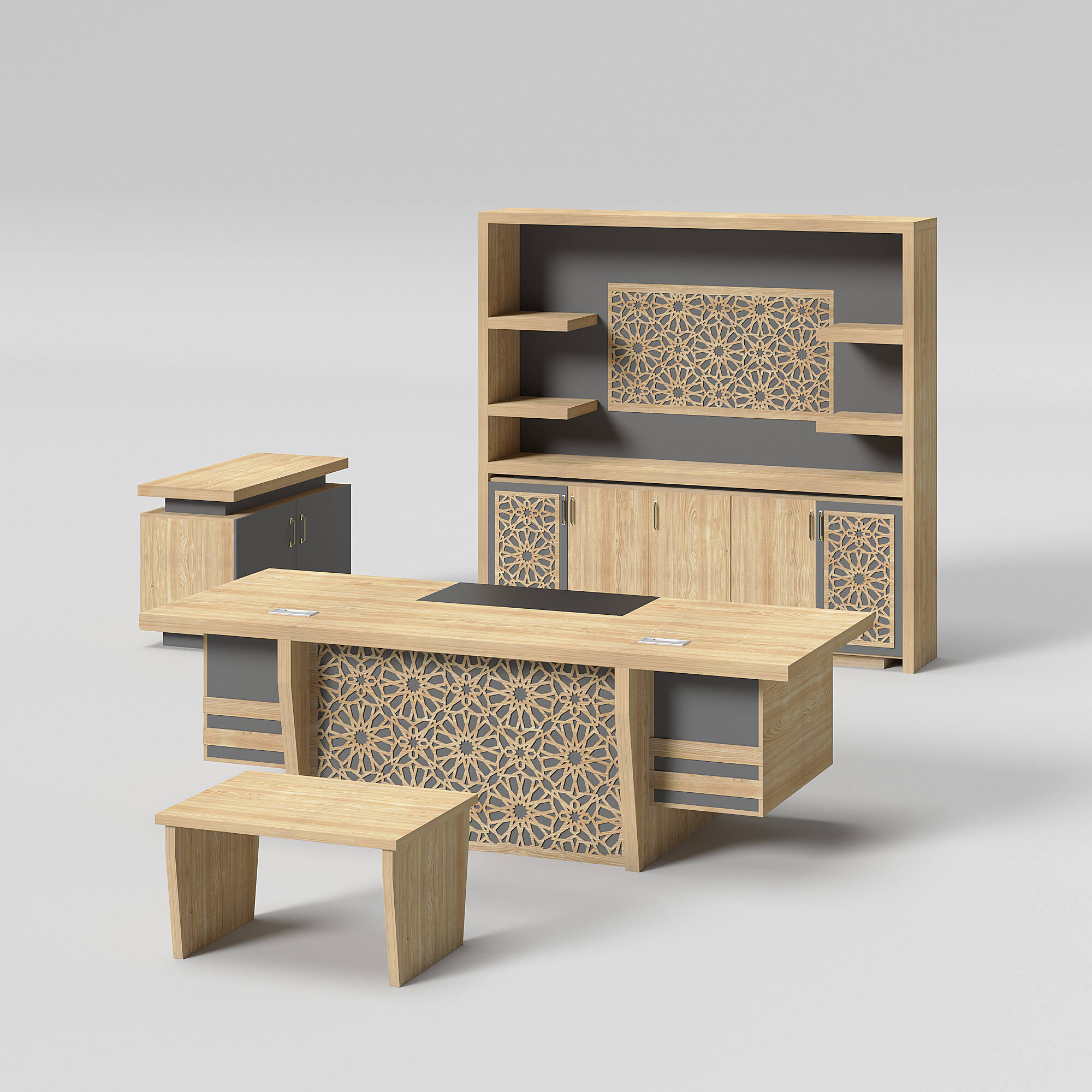 Introducing our modern-style office table. This set includes an office table, a side table, a cabinet, and a coffee table. Its unique design and color scheme make the table set stand out. We offer a variety of colors and sizes for you to choose from, allowing for customizable combinations to meet your needs.